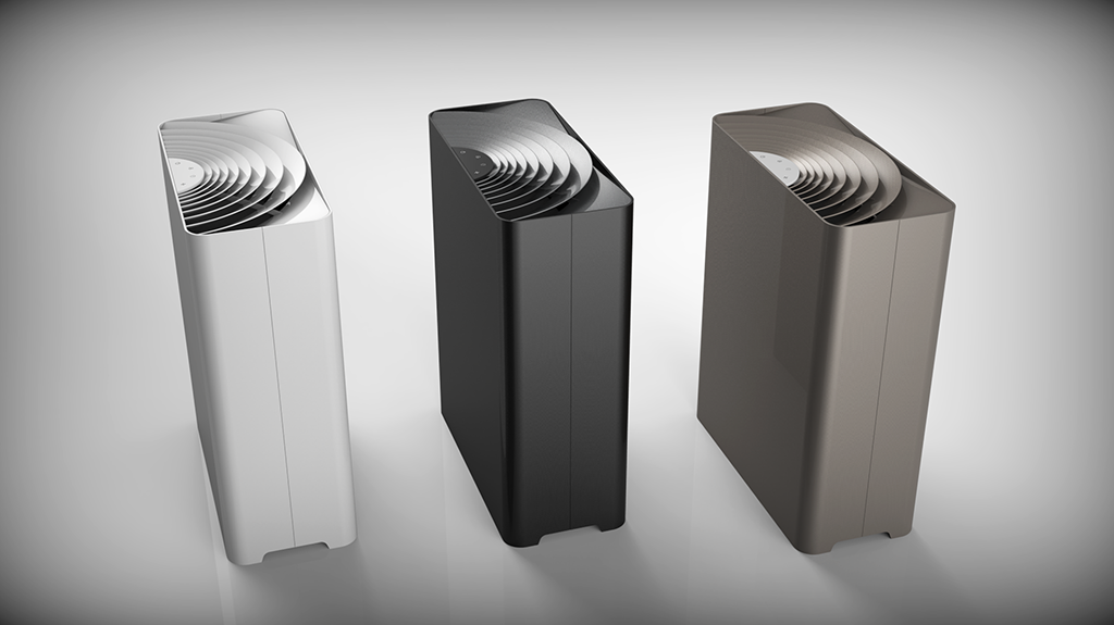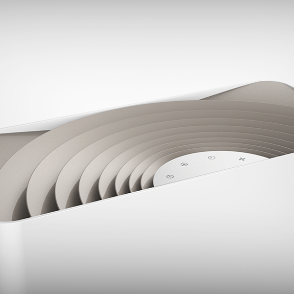 整體的設(shè)計(jì)概念大多取自自然的元素,增加了工業(yè)產(chǎn)品的人情味。材質(zhì)的選用和搭配簡(jiǎn)潔明了,不突兀,更容易融入各種使用環(huán)境。出風(fēng)口的設(shè)計(jì)抽象于安靜水面上泛起的一絲漣漪,擴(kuò)散的語(yǔ)言也符合出風(fēng)的寓意。機(jī)器背面的進(jìn)風(fēng)口的設(shè)計(jì)在符合整體有機(jī)、自然的風(fēng)格下也加強(qiáng)了進(jìn)風(fēng)的產(chǎn)品語(yǔ)義。整體設(shè)計(jì)在平面的外表下又具備一些充滿靈氣的細(xì)節(jié)。